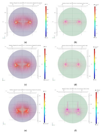 Figure 3e,f present the magnetic flux density norm and the electric field of P3 using a 20 g/L of OF sample. The magnetic flux density norm values obtained varied from 2.20 T to 0.23 T along the edges of the induced coil, and from 2.45 T to 0.32 T along the centre of the induced coil. In the case of air, the electric field varied from 103.46 V/m to 5.43 V/m along the edges of the induced coiled, and from 25.25 V/m to 5.47 V/m along the centre of the induced coil. For pure water, the obtained values of the electric field varied from 158.98 V/m to 16.32 V/m along the edges of the induced coiled, and from 26.86 V/m to 8.8 V/m along the centre of the induced coil. In the case of seawater, the electric field varied from 251.89 V/m to 21.14 V/m along the edges of the induced coiled, and from 27.25 V/m to 8.76 V/m along the centre of the induced coil. For the samples of 2.5 g/L of OF, the values of the electric field varied from 230.48 V/m to 35.65 V/m along the edges of the induced coiled, and from 26.95 V/m to 8.85 V/m along the centre of the induced coil. In samples of 12.5 g/L of OF, the electric field varied from 257.77 V/m to 37.03 V/m along the edges of the induced coiled, and from 27 V/m to 11.19 V/m along the centre of the induced coil. Finally, for samples of 20 g/L of OF, the values of the electric field varied from 259.05 V/m to 39.62 V/m along the edges of the induced coiled, and from 27.05 V/m to 13.24 V/m along the centre of the induced coil.