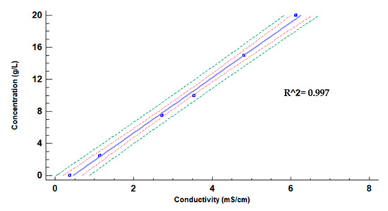 As OF, we selected commercial produce, mainly used for citric crops as orange tree or lemon tree crops [38], which can be found in several specialised shops. We have chosen a semiliquid fertiliser to perform the experiment, due to its fast dilution in water. The selected product is called “ORGANIC” (trade name), and it was acquired in the garden section of Leroy Merlin. The selected OF is an organic-mineral fertiliser NK 3.5, which has 3% of organic nitrogen (N) of beetroot, 5% of potassium oxide (soluble in water), and 24.7% of organic carbon (C). The density of this product is approximately 1.3 g/cm3 at 20 °C. Before starting the calibration, we prepared the samples and measured their conductivity with the Basic 30 to verify the correlation, 1 to 1, between both OF concentration and conductivity. This correlation is shown in Figure 5.