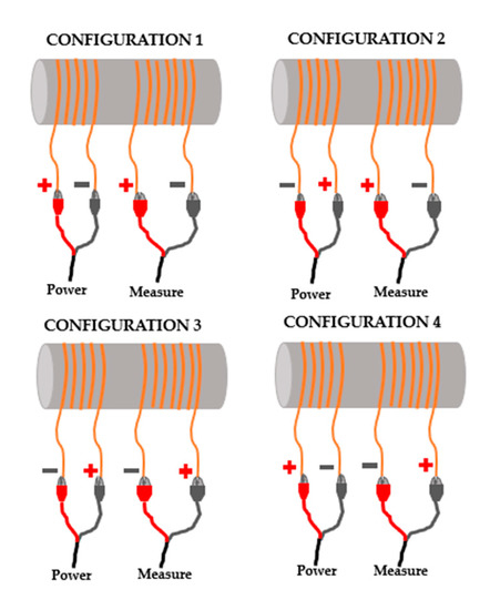The prototypes were coiled in a clockwise direction, where the other end of the coil was used as a ground reference. The sensors were fed using a 3.3 Voltage peak to peak (Vpp). This paper offers new contributions as the evaluation of the effect of different electrical configurations, meaning, different modes of connections between the devices (generator and oscilloscope) and the coil in the Vout. Figure 3 portrays the implementation of four different configurations, where the polarity of feeding and measuring changed, and, therefore, the polarity of generated magnetic fields changed. The objective is to evaluate if the different configurations modified the Vout, and, if they did, which configuration provided the best results for the detection of OF. In the four cases, the modification in the connection changed how the magnetic field behaved, and how it interacted with the environment and with the IC.