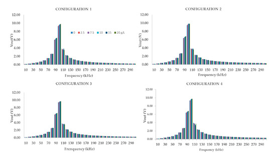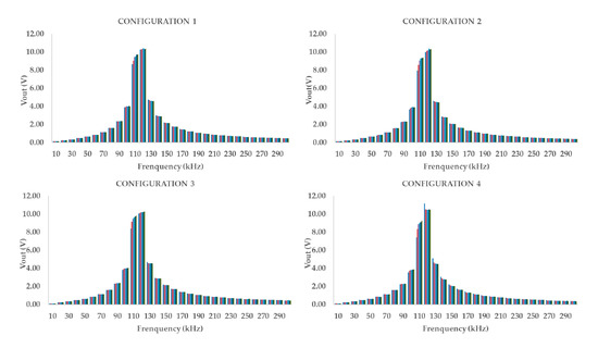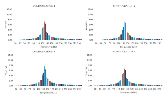 For the third prototype, the results are represented in Figure 9. For this prototype, ranges with Vout higher than 3 V cover between 130 kHz and 150 kHz. In this case, the highest Vout that we registered is the smallest one among the three prototypes, 6.35 V. P3 shows that the voltage peak is located in a higher range of frequency than in other prototypes. Table 4 shows the highest difference of Vout between the minimum and maximum concentration of OF. The maximum difference is found at 140 kHz in three out of four configurations and 130 for the other, as found with P1. Notwithstanding what we detected in P1 and P2, the data of P4 shows the maximum Vout for the less concentrated sample, in three out of four configurations. The maximum difference between higher and lower Vout is detected in the configuration 3, with −1.47 V.