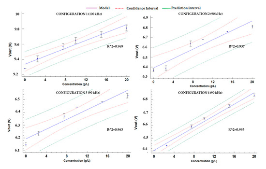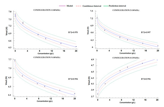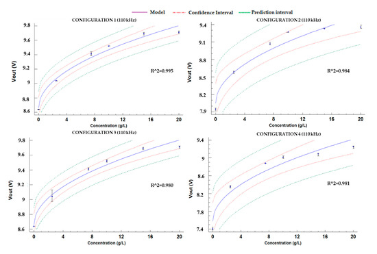 The process to have the calibration was performed as follows. Initially, we essayed with the four prototypes, testing each one in a specific spectrum of frequency, from 10 to 300 kHz, to find the WF. It was done considering the four configurations of each prototype, as indicated in Figure 6. After analysing the range of frequency, where the P1, P2, and P3 were more affected by the concentration changes, we chose the WF for each prototype in the four studied configurations. Furthermore, we used the Vout values in the WF to obtain a mathematical model for the tested prototypes to verify which equation adjusted better to obtain data. To get this, we used specific software, Statgraphics [39], which is very useful for analysing the values.