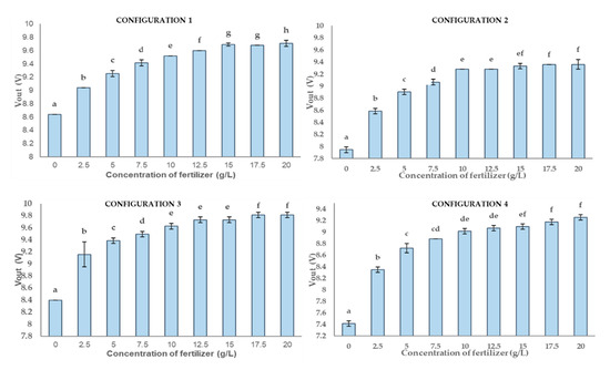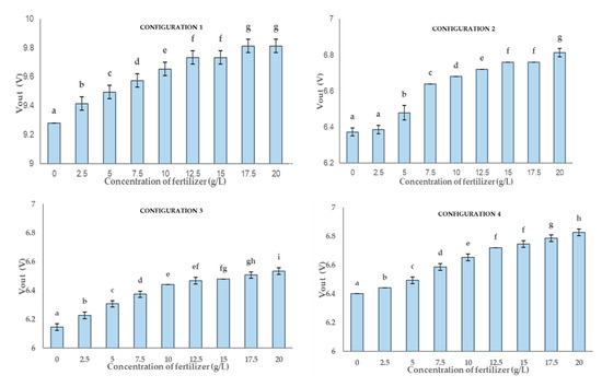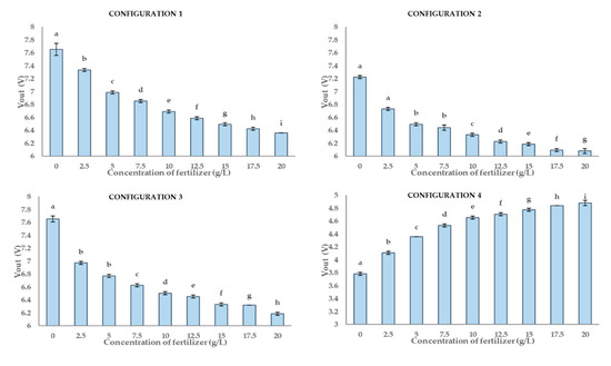 With regard to configurations 1 to 3, which share the same WF, the difference among the lowest and highest concentrations are 1.29, 1.15, and 1.47 V respectively. Meanwhile, configuration 4, characterised by the lowest WK, has a variation in the measured Vout of −1.09 V, which is lower than the variation for other configurations. If we analyse in detail, the different maximum and minimum values, not only the differences between them, configurations 1 and 3 have a similar pattern. Both configurations have similar values, 7.65 V for configuration 1 and 7.65 V for configuration 3 in the case of the less concentrated sample. Meanwhile, for configuration 2, the Vout is 7.23 V for the same sample, a variation on nearly 0.4 V is found. It has no sense to compare the differences with the results with the fourth configuration since the last configuration is characterised by a behaviour similar to the one found in P1.