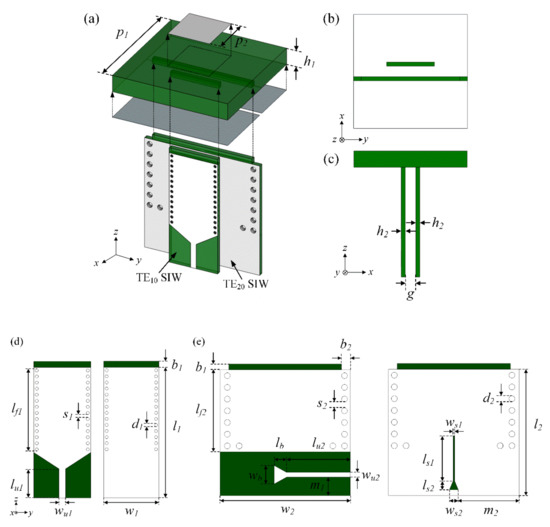 Design approach and geometry of the proposed antenna: (a) isometric view of the proposed antenna; (b) bottom view of the patch antenna; (c) side view of the proposed antenna; (d) top and bottom views of the substrate integrated waveguide (SIW) feeder for TE10 mode; (e) top and bottom views of the SIW feeder for TE20 mode.