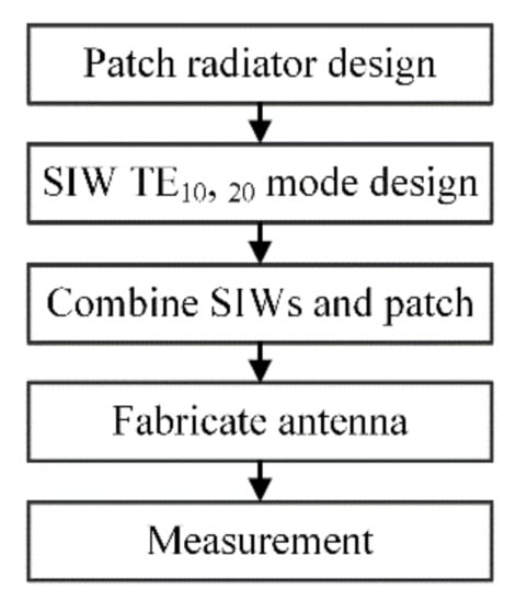 Figure 1 shows the geometry of the proposed monopulse antenna using a single patch radiator with a simple multi-mode SIW feeder. The antenna structure is divided into three subsections of a microstrip patch, a TE10 mode SIW, and a TE20 mode SIW. All three parts are printed on thin FR4-substrates (εr = 3.8, tan δ = 0.018) with thicknesses of h1 and h2. Figure 2 depicts the flow chart of a design methodology for the proposed antenna. First, the radiating patch is placed on the substrate with a width of p1, and the patch width is adjusted by the parameter p2. Second, we design the multi-mode feeding network consisting of two SIWs with different modes, which are excited by the microstrip lines. The two SIW feeders are spaced apart by a gap of g, and they have a low profile with a simple structure for fabrication compared to conventional complicated waveguide comparators. The SIW in Figure 1d has a width of w1 and a length of lf1. Via holes with a diameter of d1 are arranged by a separation distance of s1 to generate the TE10 mode that results in the sum pattern. These essential SIW parameters are determined using a conventional SIW equation in [32]. The SIW is then connected to a subminiature version A (SMA) connector through the microstrip line with a length of lu1 and a width of wu1 to excite the TE10 mode at 4.85 GHz. Similarly, the SIW for the TE20 in Figure 1e has the design parameters of w2, lf2, d2, and s2. However, different from Figure 1d, a microstrip line (wb, lb, lu2, and wu2), along with a slot (ls1, ls2, ws1, and ws2), is used to effectively generate the TE20 mode at the same frequency, where the triangular slot is designed to obtain the impedance matching using microstrip to slot feeding transition technique [33,34,35]. Note that the SIWs have physically larger sizes than the patch radiator, since the patch radiator is excited through the rectangular coupling aperture constructed by the cross section of the SIW and the bottom of the substrate. It is because that the electric fields inside the substrate of the rectangular patch antenna need to be distributed with TMmn mode based on the cavity model [36,37,38]. Then, all sections are combined by vertically inserting the SIW feeding parts into the patch antenna. For detailed tuning, all parameters are optimized using a genetic algorithm (GA), and the best result is chosen from the final generation to fabricate the proposed structure. The detailed design parameters are listed in Table 1.