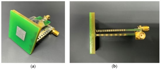 Figure 3 presents photographs of the fabricated antenna, in which all three parts are combined. Each part is designed to be assembled like a separate block so that they can generate each sum and difference pattern through the single rectangular radiator simultaneously. The microstrip lines, baluns, and patch radiator of the proposed antenna are fabricated by etching the metallic surface on the FR4-substrate, while the SIW is implemented by drilling a number of holes in the substrate and applying metal paint on the perforated surface.
