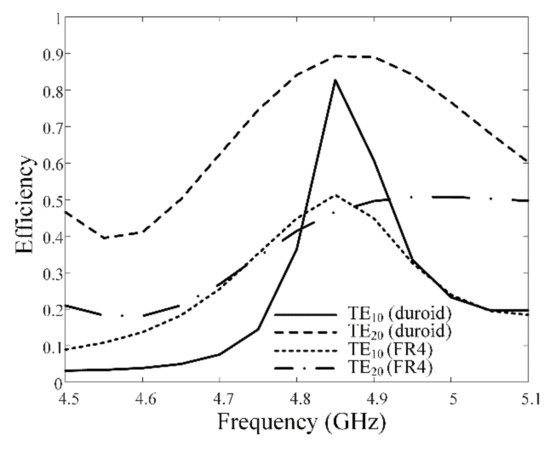 Figure 4 presents a comparison of the measured and simulated reflection coefficients of the SIW for both the TE10 and TE20 modes. For the TE10 mode, the measurement of −18.8 dB agrees well with the simulation of −15.8 dB at 4.85 GHz, as shown in Figure 4a. Figure 4b again shows the reflection coefficients of the SIW for the TE20 mode, where the measurement and simulation are −11.5 dB and −16.6 dB, respectively, at the same frequency of 4.85 GHz. Figure 5 shows the measured mutual coupling in comparison with the simulated data as a function of frequency. Measured and simulated mutual couplings are −37.8 dB and −34.9 dB at 4.85 GHz, respectively, and they are maintained below −30 dB from 4.5 GHz to 5.5 GHz. From these results, it can be seen that even with a single radiator, the patterns of each mode are well generated without significantly affecting each other. Figure 6 shows measured and simulated radiation efficiencies of the proposed antenna. The measured efficiencies of TE10 and TE20 modes were 38% and 29% at the target frequency of 4.85 GHz. There is an efficiency reduction due to conduction and dielectric losses. For example, when the TE10 mode is excited by the total available power of 1 W, the resulting total power loss is 0.62 W (efficiency = 38%). Over this total loss, the dielectric and conduction losses are 0.59 W and 0.03 W, where the dielectric loss is dominant. The detailed values of the losses and the efficiencies for each SIW mode are listed in Table 2. To improve the antenna radiation efficiency, we designed another model using a Duroid 5880 (εr = 2.2, tan δ = 0.0009) substrate for a low loss material. The detailed parameters of the efficiency improved model are listed in Table 3. Figure 7 shows the simulated efficiency results for the Duroid and FR-4 designs, and the antenna efficiency can be increased up to 82% at 4.85 GHz using the Duroid substrate compared to that of 38% for the FR-4 substrate in the TE10 mode.