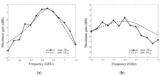 Simulated and measured maximum gains in the upper hemisphere of the proposed antenna: (a) TE10 mode; (b) TE20 mode.