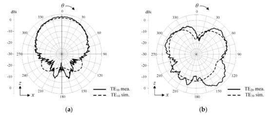 Two-dimensional radiation patterns of the proposed antenna: (a) TE10 mode; (b) TE20 mode.