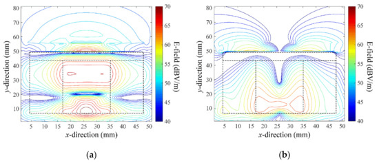 of 51.3 Ω and 15.0 Ω are obtained, respectively. Figure 11a,b show the E-field distributions of