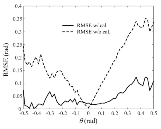 Figure 13 shows the root mean square error (RMSE) with and without the calibration for the DOA estimation according to the incident angle θ. The RMSE values are averaged at incident angles between −0.5 and 0.5. Through this calibration, the average RMSE of 0.07 is obtained, which is 0.1 lower than that of the uncalibrated result.