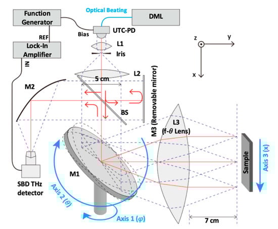 The schematic of the THz imaging system is shown in Figure 1. A dual-mode laser (DML) generates a frequency-tunable optical beating signal, which was converted to the THz radiation by a UTC-PD. The output power of the THz radiation was about 50 microwatt at 300 GHz. Details of the DML and the UTC-PD were described in our previous works [,,]. We used two custom-designed, high-density polyethylene lenses (L1 and L2) and a variable iris for the spatial filtering and the collimation of the THz beam. A membrane-type 50:50 THz beam splitter (BS) [] was inserted. The transmitted THz beam was mechanically scanned by a 7 cm diameter circular monogon mirror. The mirror surface was tilted by 45° from its primary rotating axis (axis 1). For two-dimensional beam steering, another rotating axis (axis 2) was inserted, and the center of the mirror surface was located at the crossing of the two axes so that the reflection point on the mirror surface was invariant during the mirror rotation. The reflected THz beam was deflected and focused on the sample surface by a custom-designed telecentric f-θ lens (L3). The working distance of L3 was set to be 7 cm, and the distortion-free field of view (FOV) diameter was estimated to be ~6 cm with a scanning angle of 40° (−20° ~ 20°) for both axes. The THz beam reflected from the sample surface was directed and focused on a commercial Schottky barrier diode (SBD) through the BS and an off-axis parabolic mirror (M2) of 5 cm effective focal length. A lock-in amplifier was used, with modulation frequency and time constant of 100 kHz and 300 μs, respectively.