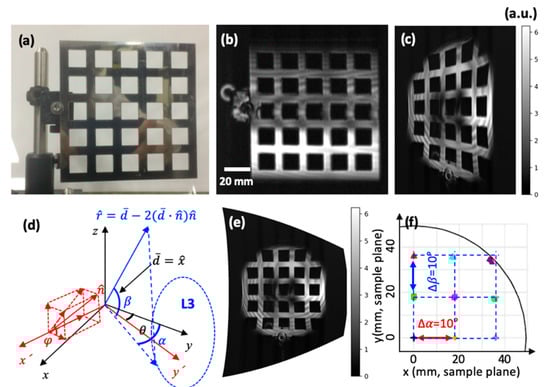 Estimation of the imaging area and distortion. (a) Metal grid sample. The grid period is 20 mm. (b) Mode 1 imaging result. (c) Mode 2 imaging result, showing significant distortion. (d) Coordinate and normal vector definitions to derive image correction equations. (e) Corrected grid image. (f) The rectangular grid on the α–β plane (grid period: 10°), projected on the object plane of L3.