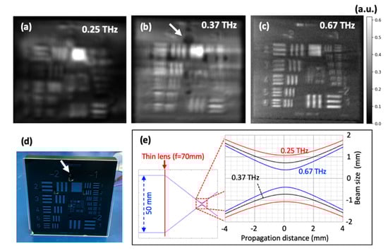 The resolution of the system was estimated by a positive-pattern USAF 1951 glass slide resolution reticle (Edmund Optics Inc.) at three different frequencies of 0.25 THz, 0.37 THz, and 0.67 THz, as shown in Figure 4a–c, respectively. The reticle is shown in Figure 4d. At 0.25 THz and 0.37 THz, up to the pattern 2 and 4 in the group -2 were resolved, respectively. These correspond to 0.280 and 0.353 line pairs/mm. In this pattern, the distances between the lines are 1.786 mm and 1.416 mm. At 0.67 THz, up to the pattern 4 of the group -1 was resolved, which corresponds to 0.707 line pairs/mm (0.707 mm line spacing). From those values, we estimate the system resolutions to be 1.786 mm, 1.416 mm, and 0.707 mm for 0.25 THz, 0.37 THz, and 0.67 THz, respectively. The experimental resolutions were compared to the theoretical spot sizes calculated by the Gaussian approximations as shown in Figure 4e. In the calculation, L3 was replaced by an ideal thin lens of 7 cm focal length. The focal diameters were calculated to be 2.13 mm, 1.44 mm, and 0.798 mm, for 0.25 THz, 0.37 THz, and 0.67 THz, respectively, as shown in Figure 4e. The experimental results and the theoretical calculations agreed well, which correspond to 1.48, 1.75, and 1.58 times of the wavelength for 0.25, 0.37, and 0.67 THz, respectively.