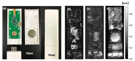 As a more practical example of see-through imaging, a commercial laser pointer was imaged at 0.67 THz, as shown in Figure 5. Images were also obtained at 0.25 THz and 0.37 THz for comparison (see Figure A2 of Appendix A). The pointer is composed of two parts that can be mechanically combined, and a printed circuit board (PCB) is inside of the upper part and a USB connector and some electronics are inside of the lower part, as shown in Figure 5a. First, we opened the plastic lid of the upper part and joined the upper and the lower parts together to obtain a THz image as shown in Figure 5b. In the image, various metallic parts were clearly imaged including metal wiring patterns on the board and small electronic components. In addition, we could clearly see a USB connector and internal structures in the lower part of the pointer. Then, we imaged the pointer after closing the lid to demonstrate the see-through capability of the THz imaging system (Figure 5c). In the image, the battery was clearly shown, but details such as thin metal patterns, small electronic components on the board inside the pointer, and the USB connector were hardly recognized. Moreover, the contrast of the metal wiring patterns on the PCB board was reversed in some parts of the imaged area (see Figure A3 of Appendix A).