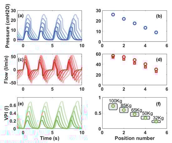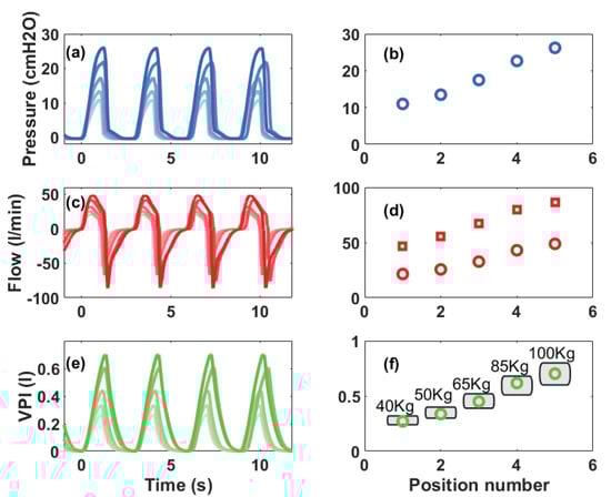 (a) Pressure as a function of time for pivot positions 1 (lighter color) to 5 (darker color). (b) Peak pressure from plots in (a) as a function of pivot position. (c) Flow generated as a function of time for pivot positions 1 (lighter color) to 5 (darker color). (d) Peak inspiratory (circles) and expiratory flow (squares) as a function of pivot position. (e) Volume pumped as a function of time for pivot positions 1 (lighter color) to 5 (darker color). (f) Peak volume pumped for the various pivot positions, the gray boxes show the recommended tidal volumes (6 to 8 mL/kg) for various predicted body weights (ideal weights) calculated from the parameters in Table 1.