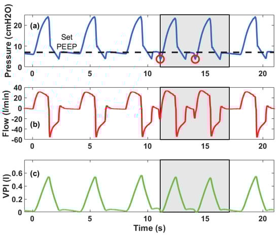 Measurements performed in order to demonstrate the additional features that can be implemented relatively easily with a digital control and a pressure sensor. Respiration rate was set to 15 BPM with inspiration to expiration ratio set to 1:2. The system was also set to trigger a breathing cycle in case of a potential inspiration (marked in gray) and to maintain positive end-expiratory pressure (PEEP), which was done with an additional mechanical PEEP valve and pressure dependent motor control. (a) Pressure obtained along several respiratory cycles. An inspiration was triggered when the pressure dropped by 2 cm HO (red circles) with respect to PEEP. This pressure drop is the signal that corresponds to a patient attempting to breath in. PEEP was set to 7 cm HO (dashed line). (b) Flow as a function of time. (c) Volume pumped as a function of time.