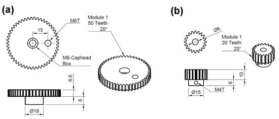 Schematic representation of the M1 50 theeth (a) and M1 20 theeth (b) gears used. Sizes shown are just for reference and have not been optimized. The design will require adjustments.