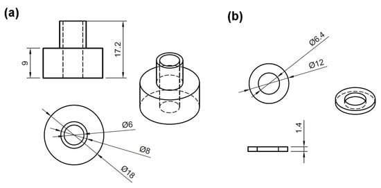 Schematic representation of the bush-bearing used at the long arm pivot position (a) is the main body of the bearing, (b) is a washer that maintains the bar in place. Sizes shown are just for reference and have not been optimized. The design will require adjustments.