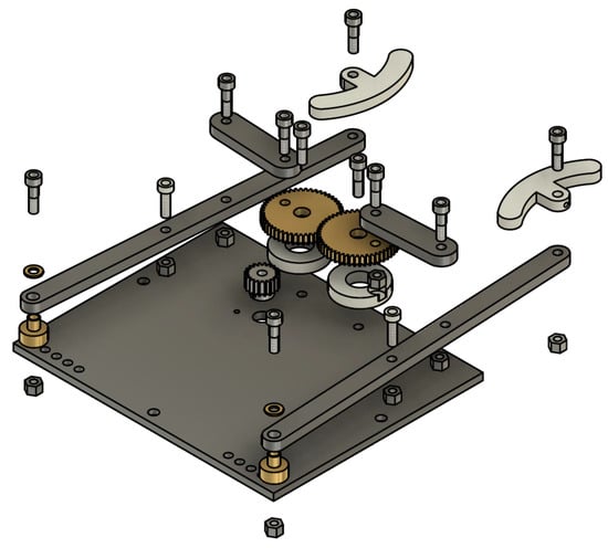 The system was driven by a DC motor ∼60 RPM in the absence of load with a maximum torque of 180 N cm. which was coupled directly to the small gear. The mechanical assemble can be seen in Figure 1 and a schematic showing the details of the assemble process in shown in Figure 14. For motion axes stainless-steel M6, cap-head screws were used with non-threaded sections. They were fixed on the M6T threads made on the base-plate, gears, or long bars with an additional counter-nut on the opposite side. All parts were machined in aluminum, except for the bush-bearings and washers (Figure 13), which were made from brass, the 50-teeth gears, which were made from brass commercial gears and the 20-teeth gear which was made from a commercial stainless-steel gear. Nylon screws were used at the M6T threads on the long arm 110 mm from the pivot point in order to give support and fine alignment control, also a counter-nut was used to fix the adjustment. A commercial PEEP-valve was fitted to the exhaust of the bag-valve in order to have control on the end-exhalation-pressure.