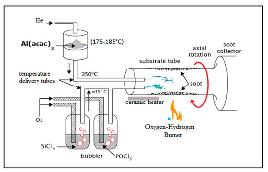 - Wang, J. Alumina as a Dopant in Optical Fiber by OVD. Appl. Phys. A 2014, 116, 505–518. [Google Scholar] [CrossRef]