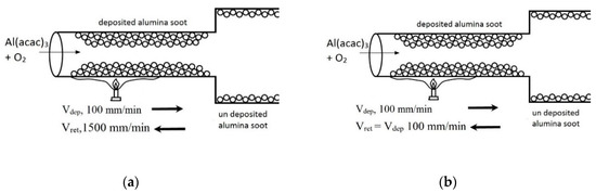 (a) The downstream deposition direction with Vdep 100 mm/min and Vret (burner return speed) 1500 mm/min; and (b) downstream and upstream deposition directions (Vdep 100 mm/min and Vret = Vdep = 100 mm/min).