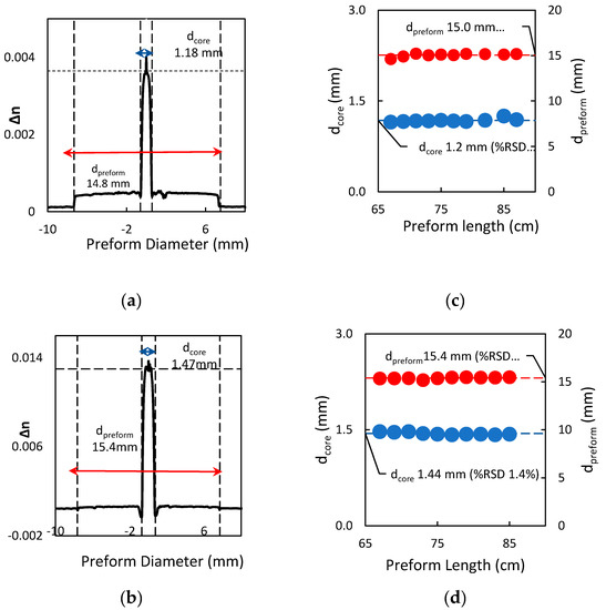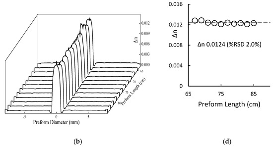 Figure 4a,b shows the refractive index profiles for P1 (TAl 175 °C) and P2 (TAl 185 °C), respectively. Figure 4c,d displays the longitudinal uniformity values of P1 (average Δn = 0.0036) and P2 (average Δn = 0.0124), respectively. As can be seen from the figure, P1 and P2 showed good longitudinal uniformity with a slight variation in the refractive index difference (percent relative standard deviation of index difference (%RSD) 1% and 2%, respectively). This good longitudinal uniformity can be ascribed to the high total gas flow rate (QT) used and the short hot zone and residence time, which result in the production of fine and uniform alumina particles, as discussed above. As is illustrated in Figure 5a–d, the core (dcore) and preform (dpreform) diameters for P1 were 1.2 mm (%RSD 2.4%) and 15.0 mm (%RSD 1.2%), respectively, whereas those for P2 were 1.44 mm (%RSD 1.4%) and 15.4 mm (%RSD 1.0%), respectively. This shows that it is possible to fabricate alumina-doped silica preforms with high uniformity of Δn and core size using Al(acac)3 and a chelate vapor delivery system.