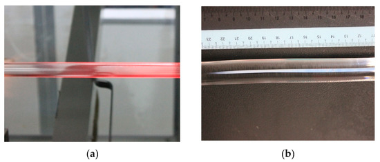 For preform P3, the deposition of alumina was performed in both the downstream and upstream directions. The upstream deposition mode is normally used to utilize a higher temperature without sintering the produced soot [20,21]. In P3, it was observed that the downstream deposition showed the same behavior as P2. In upstream deposition, however, more alumina with large particle size distribution is produced. In this case, the alumina particles are deposited behind the moving burner and are partially sintered since the burner is moving away towards the reactant inlet. In addition, the upstream deposition mode provides higher temperature and a longer hot zone, which, in turn, result in longer residence time and enhanced conversion or oxidation of Al(acac)3. This causes more particle nucleation and agglomeration and, hence, larger particle size distribution in the produced alumina soot [20]. In both P2 and P3, the effect of QT/α was the same where the length of deposition was observed to be long (i.e., taper region). It is worth mentioning that during the sintering process for P3, a red glow with intensity increasing towards the exhaust tube was observed along the substrate tube (Figure 6a). This is indicative of the high concentration of alumina and was manifest in the collapsed preform where the core had an opaque center stretching from about the middle of the preform to the outlet with increasing opacity towards the outlet (Figure 6b). This may be attributed to the deposition of Al2O3 in the tiny spaces between silica soot particles. The high temperatures encountered during sintering and collapse may then be enough to cause some aluminum diffusion into the silica, thereby producing regions of alumina-rich silicates. The slow cooling of the produced materials as the burner moves away from these regions promotes solidification to a crystalline (rather than an amorphous) phase, causing opacity of the core. Another explanation is the formation of alumina-rich silicates by phase separation and crystallization. This may take place when the binary oxide mixture (Al2O3/SiO2) encounters a suitable temperature during sintering or collapse, provided that the aluminum concentration is high enough [22].