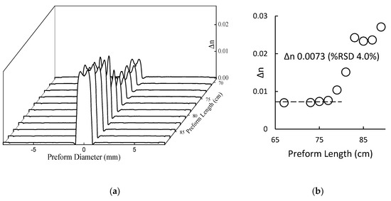 (a) The refractive index profile and (b) the longitudinal variation in the refractive index difference (Δn) for preform P3.
