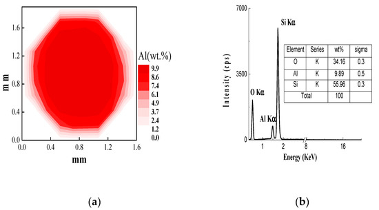 (a) A contour plot of the Al concentration in the core region of preform P3. The EDX point identification measurements were performed for 10 × 10 grid points covering an area of 2.0 × 2.0 mm. The sample for EDX analysis was cut from the edge of the preform adjacent to the outlet. (b) The EDX spectrum measured at the point with the highest Al concentration (9.9 wt.%). The inset table lists the wt.% of Al, Si, and O.