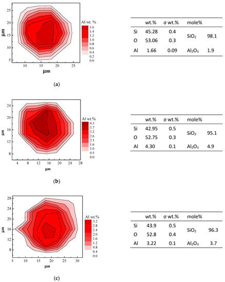 Contour plots of Al distribution across the core of fibers (a) F1, (b) F2, and (c) F3. The highest Al concentrations detected in F1, F2, and F3 were 1.7, 4.3, and 3.2 wt.%, respectively. The corresponding concentrations of Al2O3 were 1.9, 4.9, and 3.7 mole% for fibers F1, F2, and F3, respectively.