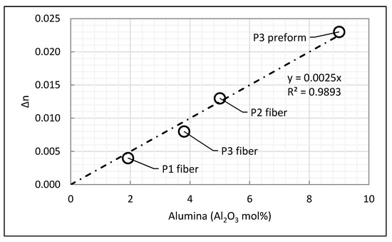 Figure 9a–c shows contour plots of the Al distribution for fibers F1, F2, and F3, respectively, that were drawn from preforms P1, P2, and P3, respectively. In general, the Al distributions for all fibers show the same pattern, with the highest Al content being located at the center of the core area. The maximum Al concentrations for fibers F1, F2, and F3 were 1.7, 4.3, and 3.2 wt.%, respectively. This corresponds to alumina concentrations of 1.9, 4.9, and 3.7 mole% for F1, F2, and F3, respectively. In the current study, the fabrication process efficiency was measured by dividing the alumina content obtained from EDX analyses of fibers by that derived theoretically. For the fabricated fibers F1 and F2, the process efficiency values were found to be 11 and 21%, respectively. These values indicate that the TAl °C is a critical factor; an increase in TAl °C of 10 °C resulted in a 3.3-fold increase in Al2O3 content. The relationship between Δn (obtained from RIP) and Al2O3 mol.% (obtained from EDX analysis) is plotted in Figure 10. As can be observed from the figure, the refractive index of silica increased by 0.0025 per mol% of Al2O3. This is in line with the results obtained by Bubnov et al. [25], where the authors used an MCVD vapor phase technique with AlCl3 as the precursor.