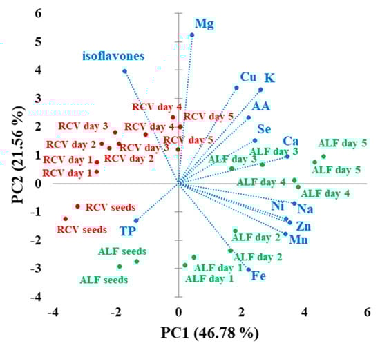 - Silva, L.R.; Pereira, M.J.; Azevedo, J.; Gonçalves, R.F.; Valentão, P.; De Pinho, P.G.; Andrade, P.B. Glycine max (L.) Merr., Vigna radiata L. and Medicago sativa L. sprouts: A natural source of bioactive compounds. Food Res. Int. 2013, 50, 167–175. [Google Scholar] [CrossRef]