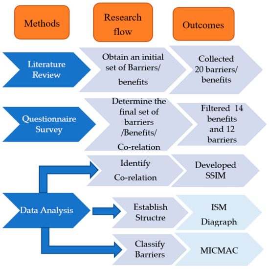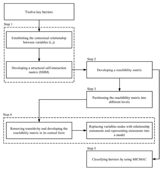 To analyze interrelationships among different factors, the Analytical Network Process (ANP) and ISM are mostly used. However, the analytical network process fails to show complete dependencies [39], whereas ISM authorizes intuition into interrelationships among different elements with ranking and direction [40]. In the construction management field, researchers used ISM to analyze factors that affect a construction worker’s productivity [41], plus the design phase of construction risks [42]. This paper generates the structural mapping of complicated interconnections of BIM implementation barriers in Pakistan’s construction industry. The methodology adopted for ISM can be seen in Figure 5.