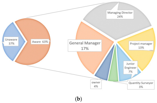 The demographic profile of the respondents is shown in Figure 3a,b and describes the awareness percentages of the respondents. After analyzing the responses, it was found that only 63% of the AEC professionals in Pakistan were aware of BIM applications.