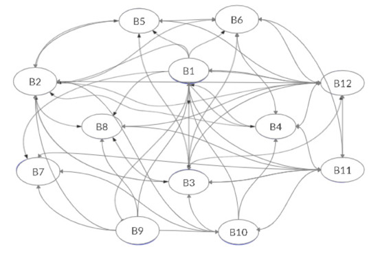 The W,X,Y,Z values in SSIM were replaced by 0 and 1 as mentioned in Table 8 [43]. The values in the reachability matrix were put as per the mentioned substitution rule. E.g., if (B1, B12) in the SSIM matrix is Y, then (B1, B12) in the reachability matrix would be 1. A preliminary matrix was established demonstrating the interrelationships among each of the 12 barriers as shown in Table 9. Further, the final reachability matrix was generated manually via excel as shown in Table 10. In Table 10, entry 1 shows incorporating transitivity. For instance, (B1, B5) is 1, which explains that there is an indirect relationship amongst barriers B1 (Lack of government regulation about BIM) and B5 (The top management do not support change).