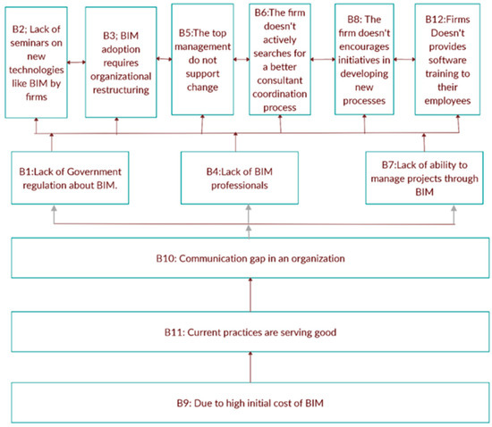 Table 10 and Figure 7 show that a high initial cost of BIM (B9) is the critical barrier in the hierarchy which forces the industry to continue with the old practices (B11-level IV). Communication gap in an Organization (B10) constitutes level-III, which further gives rise to the important level-II barriers, i.e., unavailability of government organization about BIM (B1), unavailability of BIM professionals (B4) and lack of abilities to manage projects through BIM (B7). Level-I consists of barriers (B2, B3, B5, B6, B8, B12) related to firm policies.