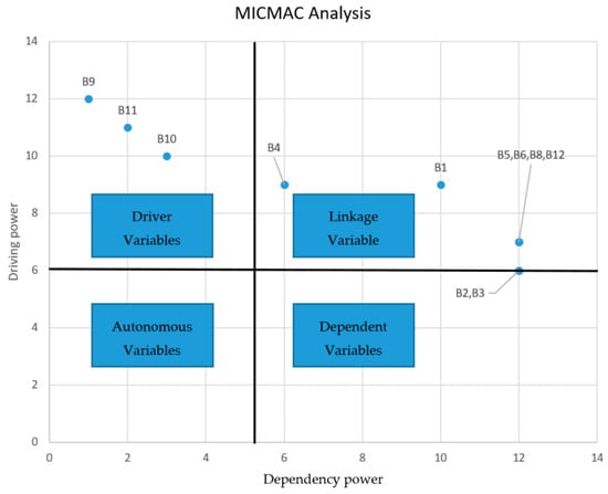 In Figure 8, a MICMAC diagram can be seen which was formed by modifying the reachability matrix. A MICMAC diagram helps in evaluation of driving power and dependence power. If the value of dependence power is higher, it illustrates that the other barriers should be addressed before the barrier with the highest dependence power is eliminated. A higher driving power means that by eliminating this barrier, other barriers could be easily solved [40].