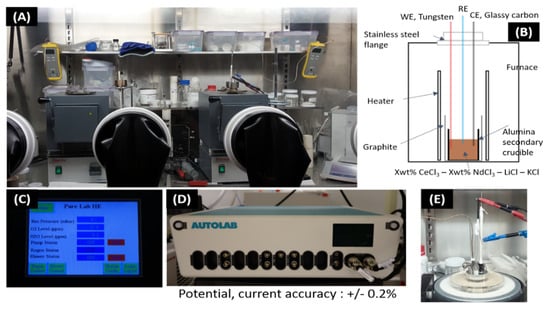 The eutectic LiCl–KCl was prepared by mixing LiCl (Alfa Aesar, Daejeon, Korea, 99.95% purity) and KCl (Alfa Aesar, 99.99% purity) in a 58.2:41.8 eutectic molar ratio followed by drying for more than 48 h at 572 K to remove residual water and melted under a high-purity argon atmosphere. This eutectic mixture was heated at 753 to 793 K with several LiCl-KCl mixtures containing NdCl3 and CeCl3 with concentrations ranging from 4 to 10 wt%. All the electrochemical measurements were carried out with Autolab/PGSTAT128N potentiostat. The data acquisition was controlled by NOVA 2.0 software for cyclic voltammetry. A three-electrode electrochemical cell was assembled in an alumina crucible, which was positioned in a graphite vessel and heated in an electric furnace. A chromel–alumel thermocouple was used for temperature measurement with an accuracy of ±1 °C. The reference electrode (RE) was self-assembled by a silver wire (1 mm diameter, 99.99% purity). The reference electrode consisted of a closed-end porous quartz tube, in which the LiCl-KCl eutectic salt containing 5 mol% AgCl was placed, and an Ag wire of 1.0 mm diameter was immersed into the molten bath. A glassy carbon rod of 2.0-mm diameter was used as a counter electrode (CE). The surface area of the glassy carbon counter electrode in contact with the salt phase was about 43.1 mm2. The working electrode (WE) consisted of a metallic tungsten (W) wire (1.0-mm diameter, 99.9% purity) dipped into a molten salt bath (Figure 1E).