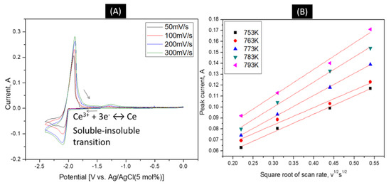 (A) Cyclic voltammogram of 4 wt% Ce3+/Ce in LiCl-KCl eutectic salt at 773K. (B) Dependence of the current versus the square root of the scan rate according to the changing temperature in LiCl-KCl-CeCl3(XCeCl3 = 8.626 × 10−3).