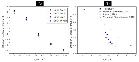 (A) Diffusion coefficient of Ce3+ as a function of CeCl3 concentration and temperature in LiCl-KCl. (B) Comparison of values from literature.