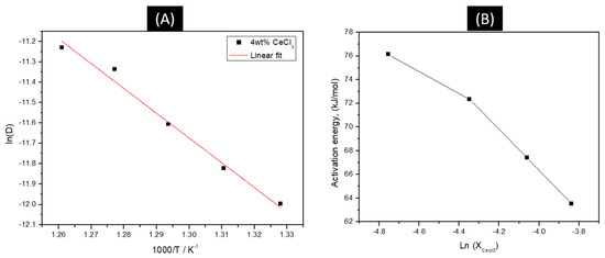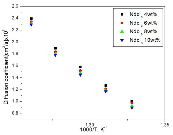 where S is the electrode area in cm2, C0 is the solute concentration in moles/cm3, D is the diffusion coefficient in cm2 s−1, F is the Faraday constant (96,485 C), n is the number of exchanged electrons, v is the potential scanning rate in Vs−1 and T is the temperature in K. The linearity of Ip versus v1/2 proves that the electrochemical reduction process is controlled by the diffusion of Nd3+ ions in the solution. Figure 6 indicates the influence of the temperature on the value of diffusion coefficient from performing a series of cyclic voltammograms at several concentrations. At least 2.2% of the difference in the diffusion coefficient as a function of NdCl3 concentration and temperature, which can be up to 3.6%, can be seen in this graph. The resulting plot in Figure 7 obeys Arrhenius’ law and can be further expressed as follows for the 4 wt% NdCl3 case: