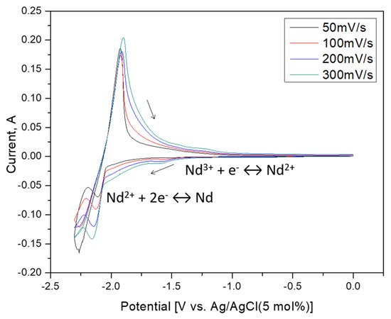 These peaks can likely be associated with the Nd3+/Nd2+ soluble-soluble redox transition. The sharper peaks should be correlated with the potential scanning rates via the Berzins–Delahay relationship, reliable for a reversible soluble/insoluble systems [21,22,23].