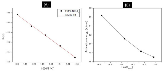 (A) Linear relationship of the logarithm of NdCl3 diffusion coefficient vs. the reciprocal of absolute temperature. (B) Activation energy as a function of NdCl3 concentration.
