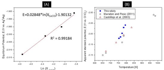 (A) −1.901 V apparent standard potential vs. the 5 mol% Ag+│Ag reference scale at 773 K. (B) Comparison of values from literature [7,14].