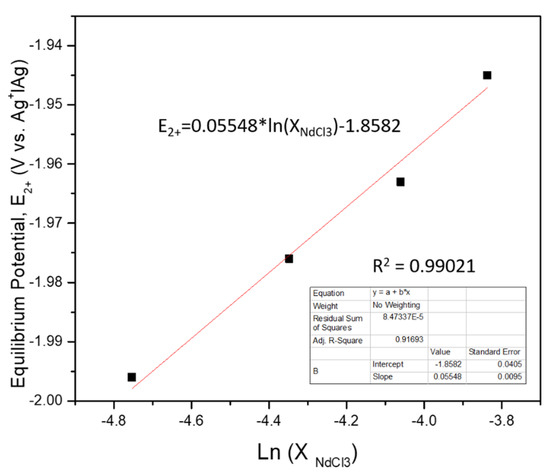 If it is assumed that the activity coefficient is constant over the range of concentrations tested, the apparent standard potential of cerium at 773 K can be calculated by plotting open circuit potential readings on a Nernst plot as shown in Figure 8A. In such a plot, the intercept is the apparent standard potential, E0 = −1.90132 V vs. Ag+|Ag reference scale (E0 = −3.0475 V vs. Cl−|Cl2). The same methods were used to create a Nernst plot as a function of temperature. Previous studies are shown for comparison, showing good agreement between these data sets, as shown Figure 8B. Using the slope from this plot, n was calculated to be 2.93, which is very close to the expected value of 3.0. In the case of Nd, due to the coexisting Nd2+ and Nd3+ oxidation states in LiCl-KCl eutectic molten salt, the usual method of calculating the apparent standard potential of the Nd3+ + 3e− Nd redox couple can no longer be applied since the exact amount of Nd3+ in the melt is unknown. However, a method applied to americium, which has +2 and +3 oxidation states, in a journal article by Fusselman and colleagues [22], can be used to provide a route to estimate the standard potential of both the +2 and +3 redox couple. The derivation is as follows: