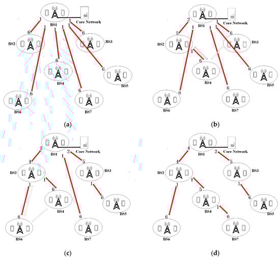 We again use Figure 3 to illustrate PSR operation. For simplicity of presentation, each BS is assumed to have only six antennas. In Algorithm 1 initialization, each BS connects to MBS and one antenna is achieved, i.e., , as shown in Figure 3a. Because there is no BS closer to , connects to directly. As the link between and requires more antennas than the link between , cannot possibly become the candidate forwarder of . Therefore, there is a set of alternative nodes of , i.e., . As for , its candidate set is . As shown by the white arrow in Figure 3b, PSR first connects and adds to , which leads to , so the performance gain of this topology is . Similarly, the algorithm calculates the difference when connects to for comparison. Assuming that connecting to yields higher utility, the parent node of is finally set as . The parent nodes of , and are also selected in the same way. As shown in Figure 3c, is determined to connect to has candidate set of parent nodes and we assume that is also a better choice, thus PSR determines the parent node of as . Finally, as shown in Figure 3d, is connected to , and the connection of the entire tree topology is completed.