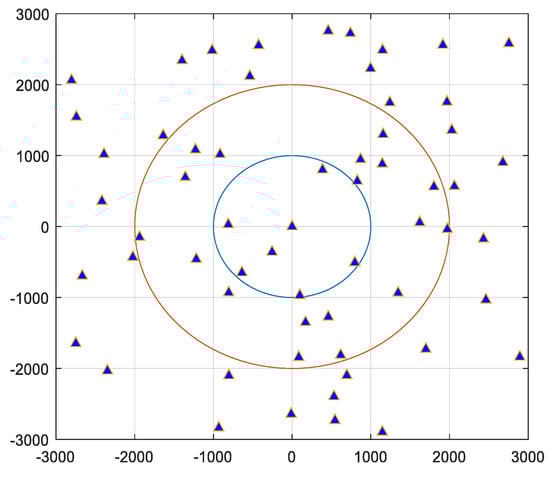 In this section, we evaluate PSR’s performance by simulation. As shown in Figure 4, a 6 × 6 km square area was generated. MBS ) was placed in the center and other BSs were randomly distributed in the area. In order to avoid unrealistic approximation between BSs, the minimal distance between any two BSs was set as 0.3 km. To observe the performance in difference distances, the overall simulation area was divided into three ranges: a circle with a diameter of 1 km (blue circle) was regarded as Area 1, nodes between the blue circle and the red circle (a circle with a diameter of 2 km) were regarded as Area 2, and the residual area was regarded as Area 3.