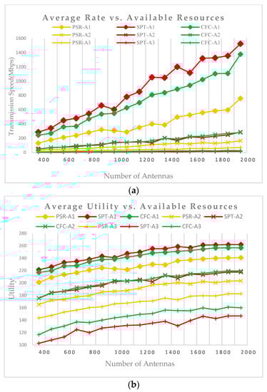 In the first simulation, we observed the performance of the three methods under different antenna resources. The total BS, i.e., , was set to 60, while of each BS was adjusted from 400 to 2000. The average utility and transmission speed (Mbps) of each area of each method are shown in Figure 5a,b. As increased, the average transmission speeds of all areas grew. Among them, BSs in the first area had obviously higher speeds in SPT and CFC because inner-layer BSs require fewer links and thus are considered more efficient to serve in SPT and CFC. On the other hand, PSR aims to maximize concave utility functions of each BS and serves BS in a more balanced way. When resources are scarce, it favors the BS with better channel quality. However, when it is served with certain amounts of resource and tends to saturate, it turns to those having more links or poorer channels. Thus, BSs in different layers had relatively approximate speed in PSR, and those in the third area had data rates higher than the other two schemes.