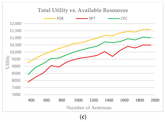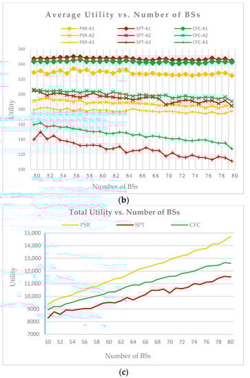 Figure 6c shows that the total utility of all three methods was improved with the increase in the number of BSs. Although the average speed would be reduced with the increase of BSs, the average marginal utility of BSs increased as more BSs require more resources. However, the utility of SPT was the lowest because its links were too short. PSR again provided the highest total utility due to its flexibility of allocation. The results also showed that a higher total/average data rate did not always lead to better system utility because the resources also needed to be allocated fairly to prevent monopolization and starvation.