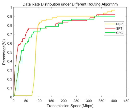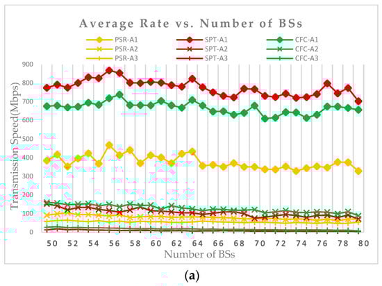 Finally, we examined the speed distribution of BSs of the three methods. Due to the fixed number of UE, only the data rate of each BS was compared. We set I to 60 and to 1200. Figure 7 shows the cumulative distribution function (CDF) of the data rate of the three methods. To quantify the fairness of the performance distribution, a well-known fairness metric called Jain’s index was used here. Given a set of numbers , Jain’s index ranges from (worst case) to 1 (best case). When each member of the set has equal value, the index becomes one. As shown in Table 2, PSR had the highest Jain’s index. About 80% of the three methods were concentrated in a range of 0–100 Mbps. The third area was large and had many low-speed BSs. Although SPT and CFC had very high inner BSs, their outer BSs had extremely low data rate, and about 60% were concentrated below 20 Mbps. This caused many BSs to work in a low-utility condition, making the overall system less effective. Due to PSR’s utility-oriented behavior, it provided a higher outer data rate, concentrated near 50 Mbps. Because of the strong marginal effect of the utility, even when the speed was doubled at low speed, it could get several times more utility improvement.